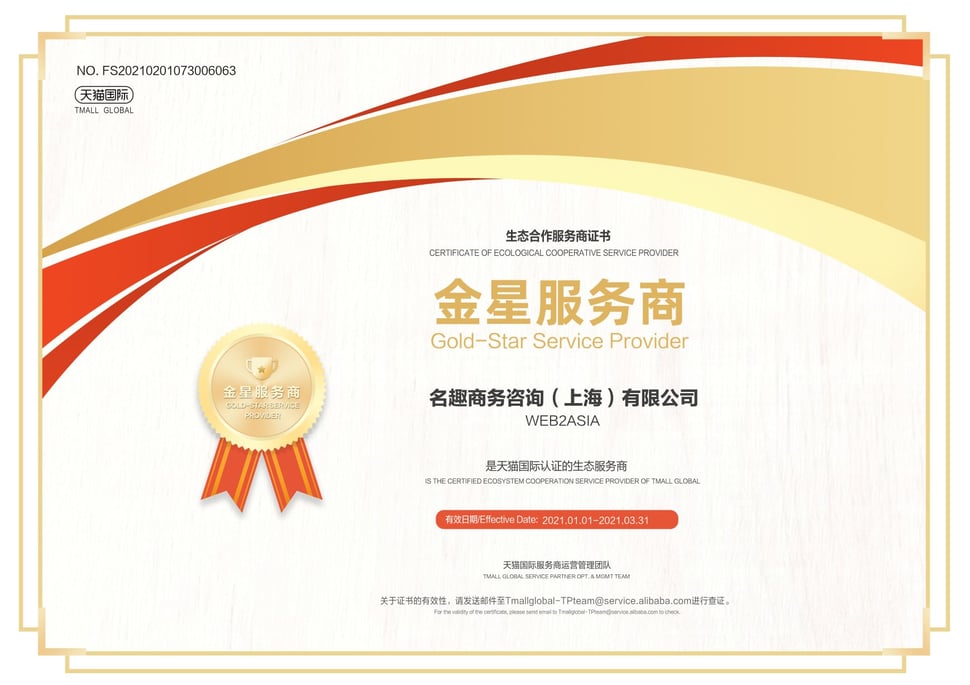 Web2Asia has been awarded 5 Star Tmall Partner (TP) by Tmall Global for the year 2020. This is the highest certification level for Alibaba Partners. We are extremely thankful for our clients' and Alibabas' trust to allow this recognition.