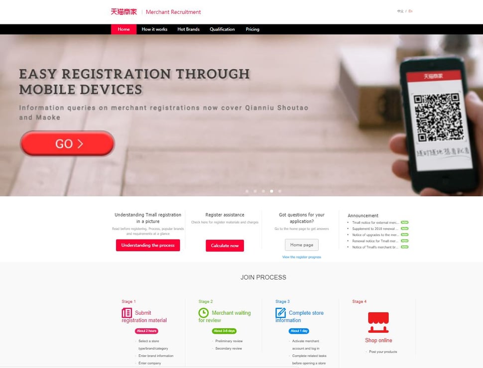 The entire Tmall store opening process for Tmall domestic and Tmall Global is now fully available in English language at https://pages.tmall.com/wow/seller/act/zhaoshang-en?spm=a223k.11631944.6107009570.4.bb7f4615uUtzAn&wh_language=en-US&acm=lb-zebra-14053-462070.1003.4.557679&scm=1003.4.lb-zebra-14053-462070.OTHER_14472755973720_557679 Also please remember that Tmall is an invitation-only platform. The list of invited brands is now also available in English here:...