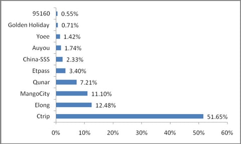 The "Online Travel Report 2007" of Baidu Data Research Center - Baidu is the leading Chinese search engine - which is based on data collected from browser cookies in Q4 2007 indicates that Ctrip is dominating the online travel market with a 51.65 percent market share. Elong (Expedia's exclusive affiliate in Asia) and Mangocity (owned by China Travel Online) lag far behind with a 12.48 and 11.10 percent market share. More